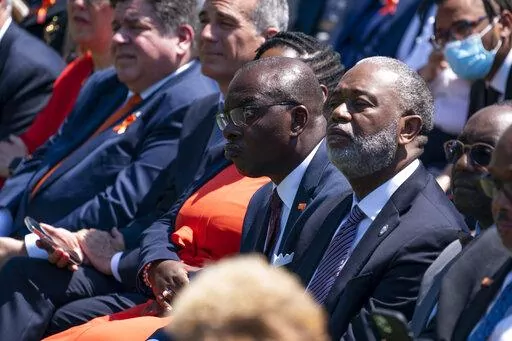 Biden hosted hundreds of guests on the South Lawn, including a bipartisan group of lawmakers who crafted and supported the legislation, state and local officials — including Illinois Gov. J.B. Pritzker and Highland Park Mayor Nancy Rotering — and the families of victims of both mass shootings and everyday gun violence.