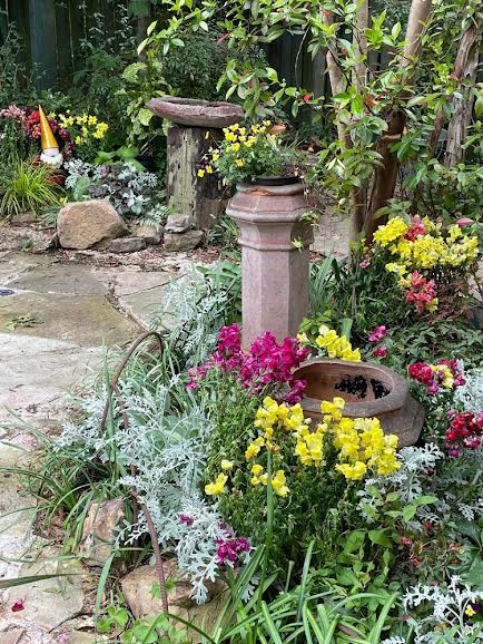 So when I recently created a small English cottage-style corner of my Mississippi garden, I started with a heavy home-made birdbath and some “chimney pots” backed with a woven “wattle” fence (made from traditional crape myrtle trimmings, for you “crape murder” haters); in between I placed small shrubs with different shapes, flowers, and colored leaves that will perform all year; then tucked in dramatically-contrasting flowering and foliage annuals and perennials to create seasonal interest. For my “thriller” I added a whimsical gnome, but coulda used a gazing globe or granny’s concrete chicken.