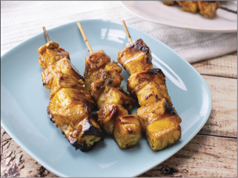 Alternately thread three chicken cubes and three pineapple chunks on each skewer.