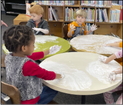 We made snow, painted our names, went ice fishing for letters and played with shaving cream. Our craft was a picture of the cold lady, and the children colored, cut, and glued the order in which she swallowed the things used to make a snowman.