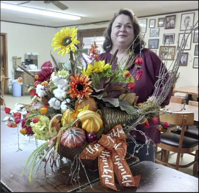 As you can see from the accompanying photos, she brought many items from her florist shop in Mathiston along with a variety of fall flowers and cut limbs from her yard to create for the Garden Club members and guests a variety of arrangements for every part of a home. She showed the group how to decorate for fall all over the house starting with your mailbox, for which she cut a sunflower wreath at the bottom and draped it over a mailbox, wired it in place below and spread the vine branches back over the box to anchor it in place.