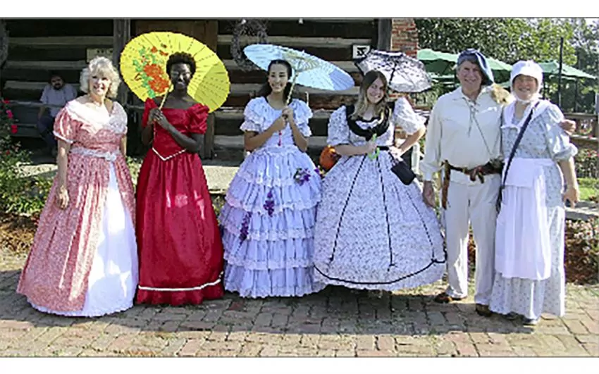 Shown in period dress, (l-r): Share Steffen, Dina Banga, Julie Kelly, Winter Bassett, Dr. Tim Comings (portraying French Camp founder, Louis Lefleur), and Leslie Comings.