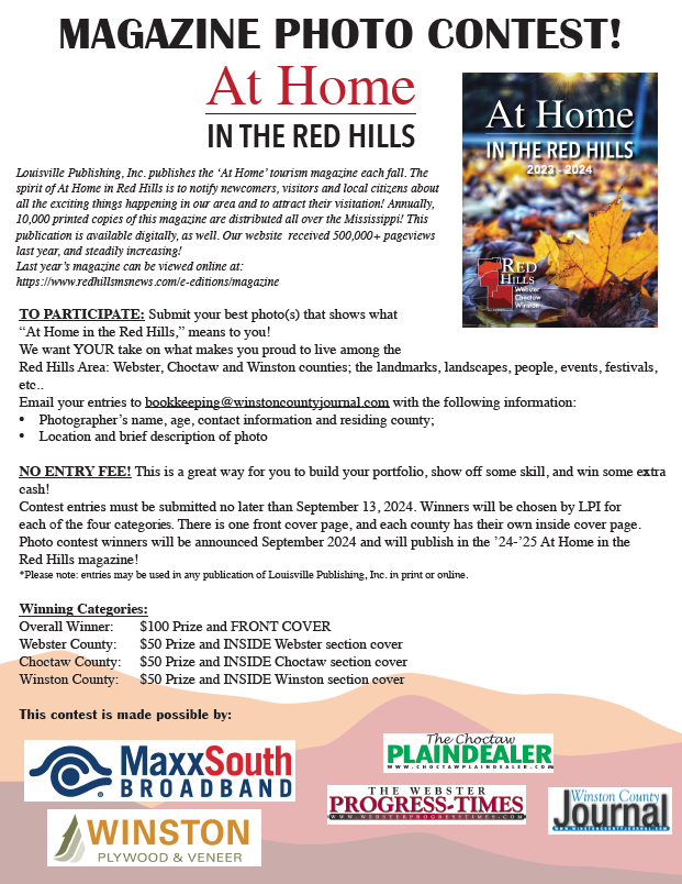 In today's edition you’ll find the flyer promoting our contest with all the details. This photo contest is for everyone of all ages; amateurs and professionals! The photos we are looking for are ones that show what it means to be ‘At Home in the Red Hills’ (Winston, Webster and Choctaw counties); such as, festivals, landscapes, events, streets, landmarks, etc.