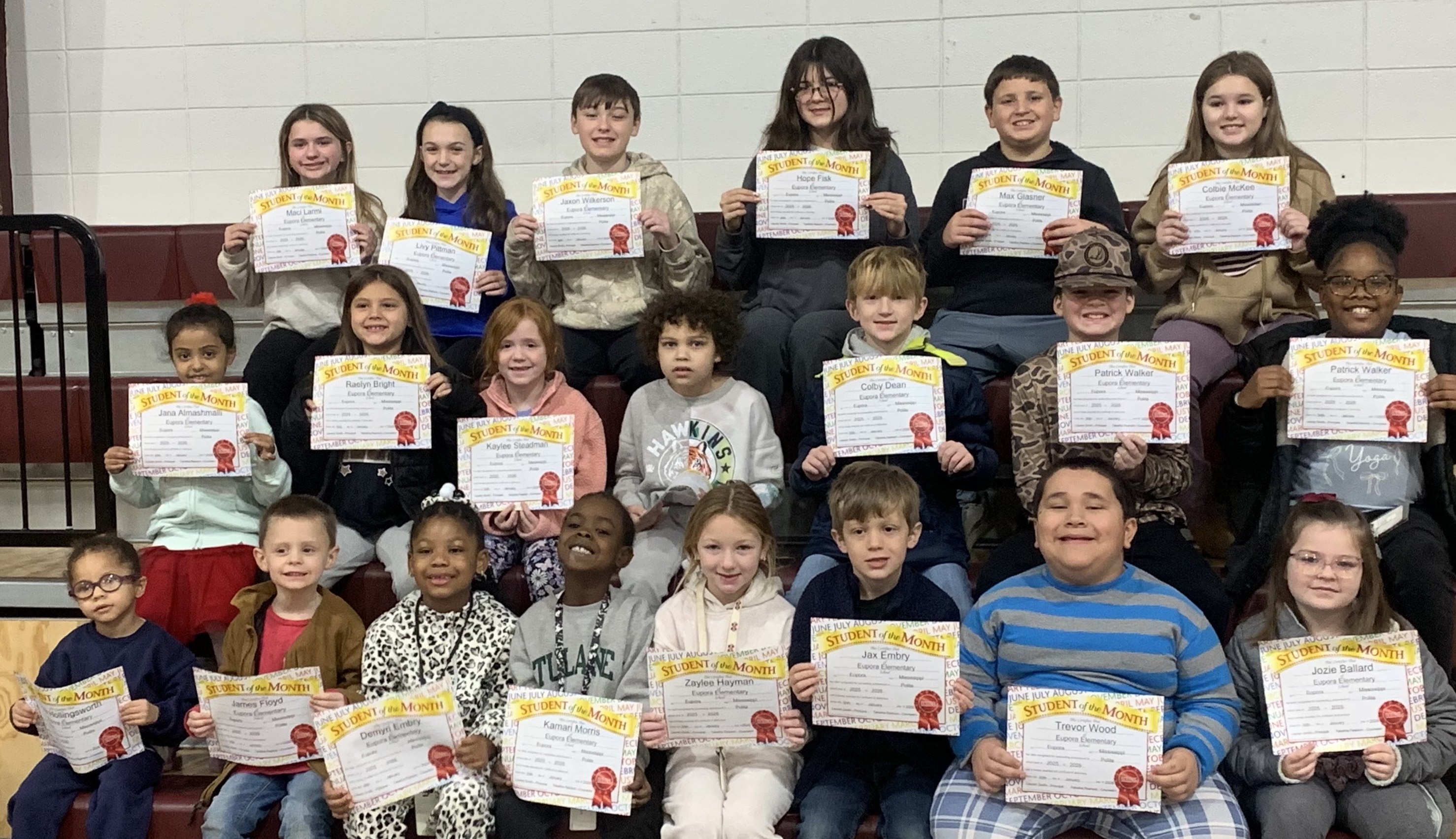 Eupora Elementary School Students of the Month for January are (front row) Olivia Hollingsworth, James Floyd, Demyri Embry, Kamari Morris, Zaylee Hayman, Jax Embry, Trevor Wood, Jozie Ballard, (middle row) Jana Almashmali, Raelyn Bright, Kaylee Steadman, Ember Brown, Colby Dean, Patrick Walker, Avah Smith, (back row) Maci Larmi, Livy Pittman, Jaxon Wilkerson, Hope Fisk,…