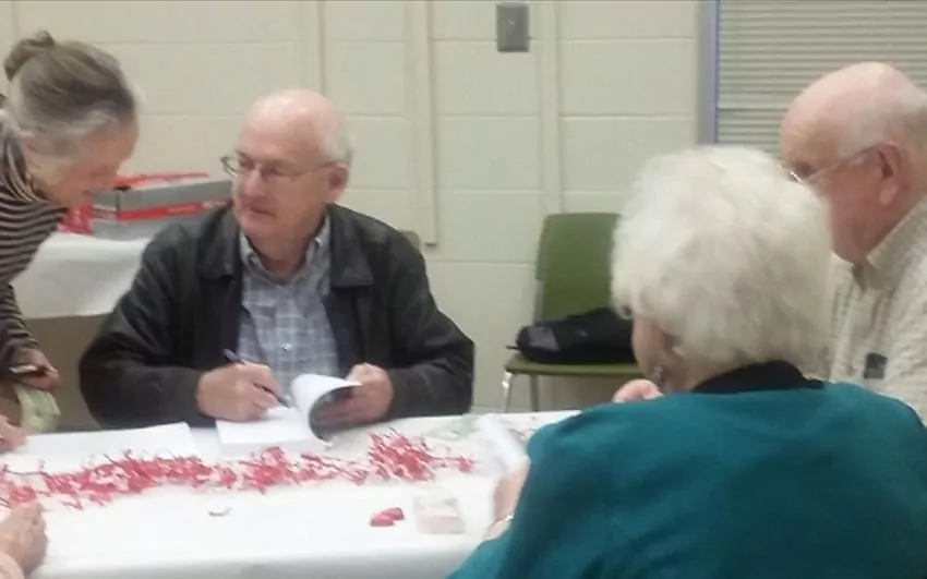 Sonny Clanton of Calhoun City was the guest speaker for Friends of Webster Library on Feb. 11. He visited with those attending, telling them about his self-published book, “Mr. Joab’s Will.” Those attending enjoyed the informative discussion, including Eloise Riley, who visits with Clanton as he signs her copy of his book.