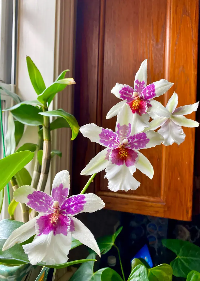 The flowers of Oncidium hybrid are delicate, hovering above the foliage like tiny ornaments on display. When in bloom, this orchid becomes a festive centerpiece in my home.