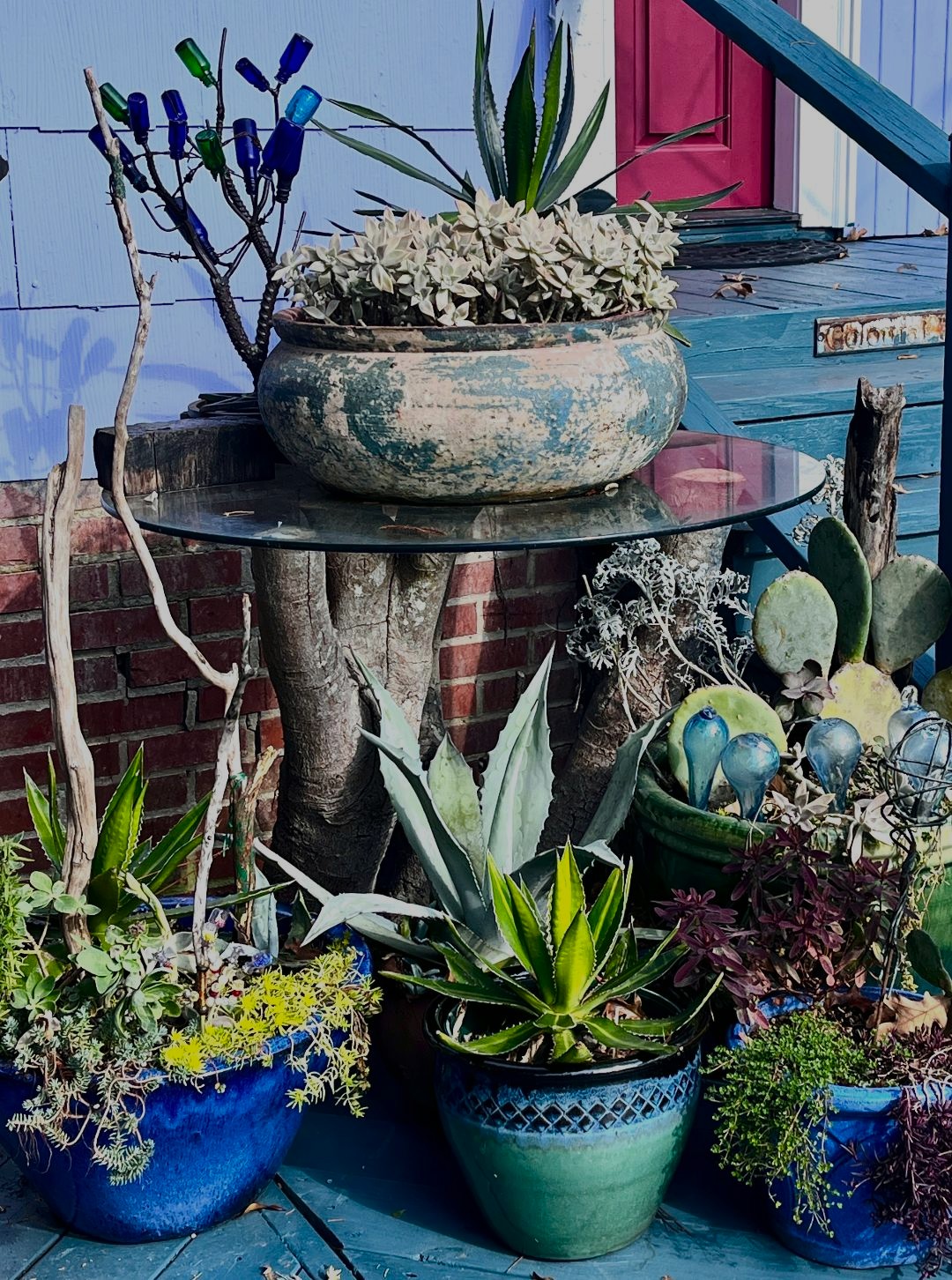 But one of the easiest ways to brighten a dull wintry scene is with colorful pots, either as standalone accents or grouped for a more dramatic effect. Filled with seasonal flowers and foliage plants, they make a very bold statement, a trick I employ with my deck collection of cold-hardy cacti and succulents, which need extra drainage in our winter rains; the green and blue pottery visually unifies the motley assortment of bizarre shapes.