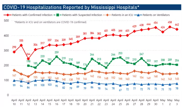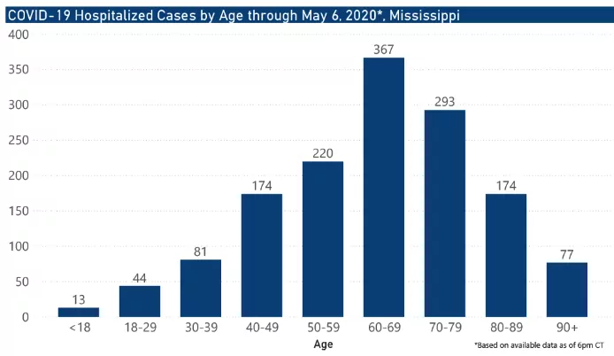 The Mississippi Department of Health reported at 11 a.m. on May 8, 404 new cases and 13 new deaths as of 6pm May 7, 2020. The totals are now 8,686 COVID-19 positive persons in the state with 396 deaths. Cases reported to the MSDH after 6 p.m. will be reported later.