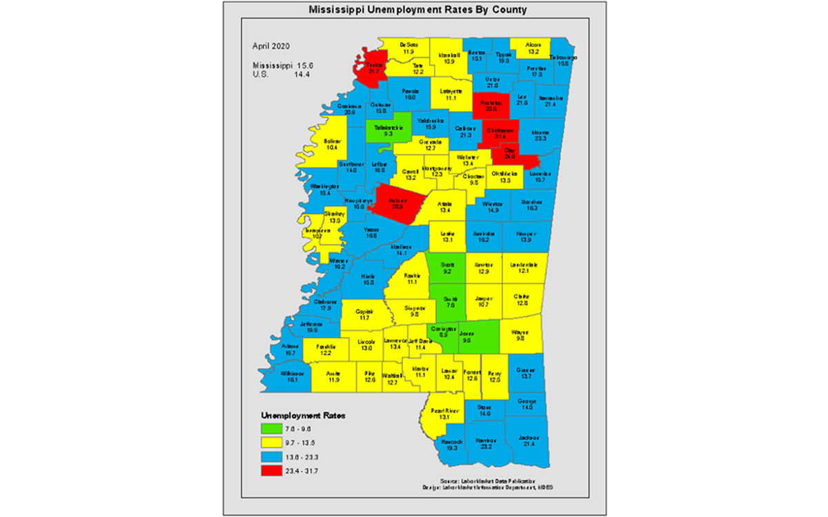 Webster County’s unemployment rate increased nearly 8 percentage points in April, the first month to fully reflect the economic impact from the ongoing COVID-19 pandemic. The county’s jobless rate in April was 13.4%, according to the Mississippi Department of Employment Security. That compares to 5.5% (revised) in March and 5.1% in April 2019. MDES statistics from 1990 forward show the county’s highest unemployment rate for April came in 1991 when it reached 17.5%. The lowest rate for that period was in 1998, when it dropped to 4%. The number of unemployed Webster Countians in April increased by 280 to 500. The labor force, which is made up of everyone who has a job or is looking for one, decreased by 240 to 3,710. “The increases in the number of unemployed and the unemployment rates, along with the decreases in the number employed and the nonfarm employment, can be attributed to the statewide shelter in place due to COVID-19,” MDES stated on its website. The state’s non-seasonally adjusted unemployment rate was 15.6% in April while the national average, also unadjusted, was 14.4%. Jobless rates in adjoining counties: Calhoun, 21.3%; Chickasaw, 31.4%; Choctaw, 9.8%; Clay, 24.6%; Grenada, 12.7%; Montgomery, 12.3%; and Oktibbeha, 13.5%. Tunica County had the state’s highest unemployment rate for April at 31.7% while Smith County posted the lowest at 7.6%. Unemployment Scams Reports of unemployment fraud continue to rise as scammers look for ways to cash in during the ongoing pandemic. MDES urges Mississippians to remember the following when filing for unemployment insurance benefits: • No Fee — There is no fee to file for unemployment compensation. MDES will never ask for a debit card or other method of payment in order to process a claim. If you receive a phone call from someone identifying them self as a representative of Mississippi Department of Employment Security, do not send money. • False Websites — Several websites advertise they can assist claimants in filing for unemployment benefits. Some of these sites offer services free of charge and others charge for services. These sites often ask for confidential/private information, such as your Social Security number, address, work history and email address. Use only the official MDES website to file for unemployment benefits. MDES does not work with, nor endorse any private service claiming to assist applicants in applying for unemployment insurance benefits. • Personal Documents — Some solicitors will ask claimants to upload a copy of their driver’s license or birth certificate. MDES will only notify you through agency-issued correspondence to ask for your documentation to be uploaded within your secure MDES account.