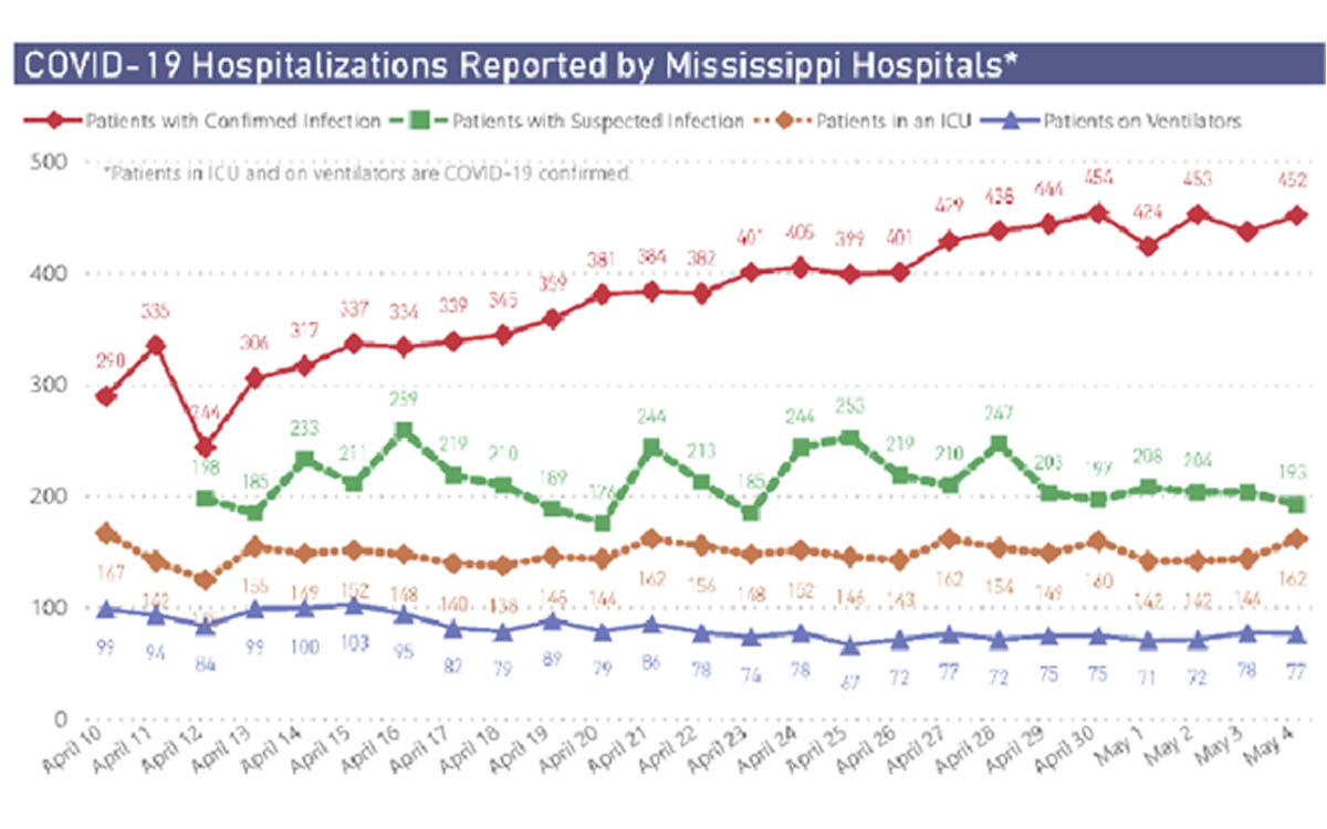 The number of Mississippians currently hospitalized with confirmed COVID-19 infection is at 452.