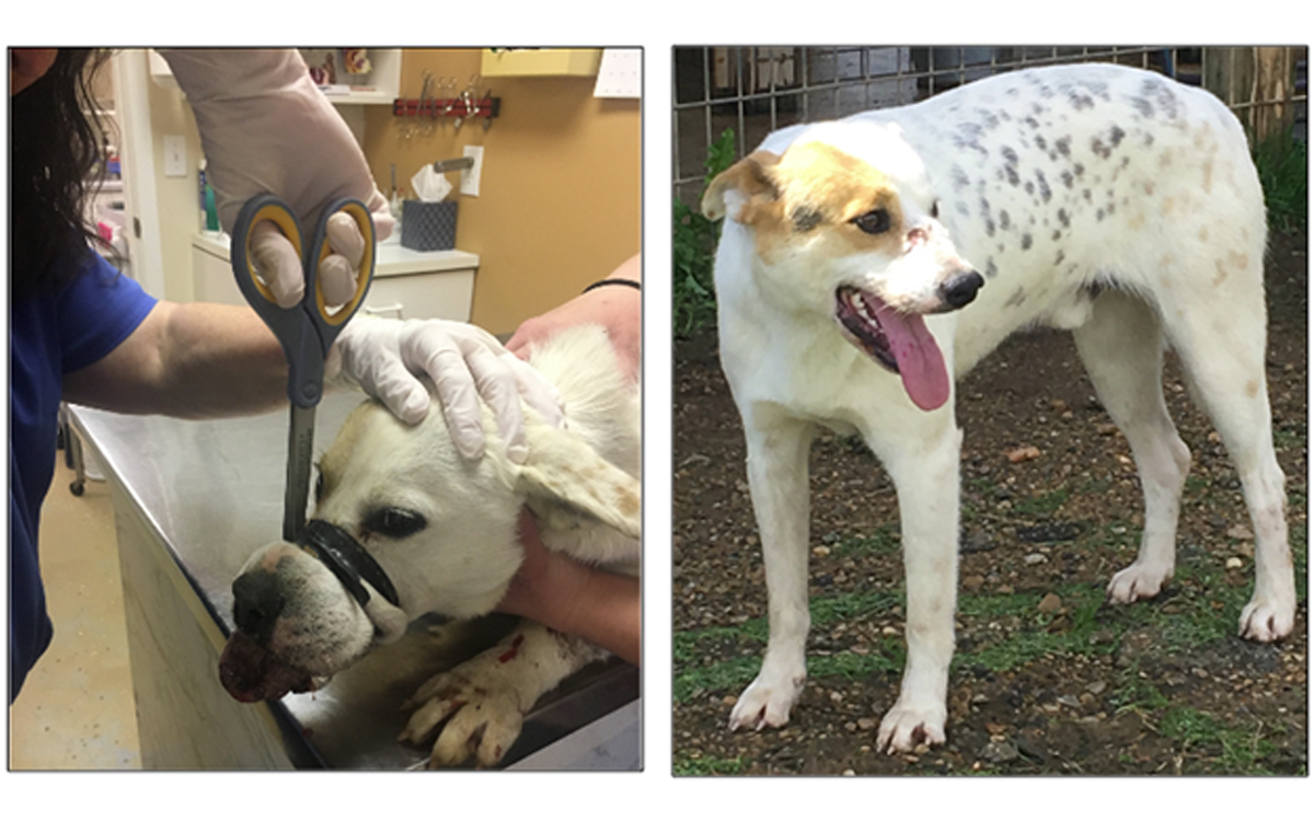 Both dogs were trapped separately the afternoon of March 8. They were immediately taken to Self Creek Veterinary Clinic for medical care, where the tape was removed from Shaw’s snout. He was given fluids because of dehydration and diluted canned food that was syringed into his mouth.