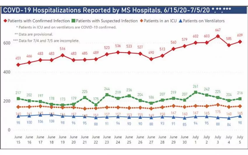 The number of COVID-19 cases in Webster County increased by five over the past week, according to the Mississippi State Department of Health. Locally as of Monday morning, 127 positive test results had been reported since March 11. That is up from 122 cases the week before. The number of deaths countywide remained at 10. The number of long-term care facility cases also remained the same, 52, which includes nine deaths. Countywide, the breakdown by race and ethnicity for the 127 total cases is categorized by MSDH as 71 white, 44 Black, six other and six unknown. Of the 10 deaths countywide, seven were white and three were Black. Risk-Assessment Map Rates County According to NPR, researchers at the Harvard Global Health Institute are leading a collaboration of top scientists at institutions around the country who have joined forces to create a unified set of metrics for the coronavirus pandemic, including a shared definition of risk levels — and tools for communities to fight the virus. The collaboration launched these tools July 1 including a (at globalpidemics.org) that allows people to check the state or the county where they live and see a COVID-19 risk rating of green, yellow, orange or red. The risk levels are based upon the number of new daily cases per 100,000 people. A community that has fewer than one daily new case per 100,000 is green. One to 9 is yellow; between 10 and 24 is orange; and 25 and above puts you in the red. As of Monday, Webster County was in the yellow zone, which indicates potential community spread. Recommended Interventions are to continue testing, contact tracing and isolation, as well as social distancing, masking and other measures. Safe Return order extended Gov. Tate Reeves’s Safe Return order was scheduled to expire Monday morning. However, on Thursday, he signed an executive order extending the social distancing guidelines and restrictions under the order until 8 a.m. July 20 after record-breaking daily reports of COVID-19 cases. Health officials believe the extension will allow more time to evaluate the state's response to the virus and adapt accordingly. Some of the strict social distancing guidelines in the Safe Return order include the following: • All those in the vulnerable population are strongly encouraged to continue sheltering in place to protect their health. This includes all elderly individuals (age 65 or older per CDC guidelines) and individuals with serious underlying health conditions, including high blood pressure, chronic lung disease, diabetes, obesity, asthma, and those whose immune systems are compromised as such by chemotherapy for cancer or any other condition requiring such therapy. • For large group gatherings when social distancing is not possible, groups are limited to 20 people or less indoors and 50 people or less outdoors. • For large groups gatherings when social distancing is possible, groups are limited to 50 people or less indoors and 100 people or less outdoors. All travel may resume, while minimizing non-essential business travel when possible. In addition to social distancing, MSDH says wearing a mask or face covering can sharply reduce the risk of passing COVID-19 on to others. Wearing a mask is strong recommended whenever you are in public places with others around you. On Friday, District 1 Supervisor Eudy Morris was handing out free face masks to passersby in front of Liberty United Methodist Church. He was assisted by Eupora Mayor Lamar Dumas. ReStart Mississippi The Mississippi Department of Employment Security has developed a new online reporting system to assist the business community and individuals who are unemployed because of COVID-19. ReStart MS (mdes.ms.gov/restartms) provides employers with information on individuals who are currently filing or have previously filed for Unemployment Insurance benefits. MDES officials say this system will help prevent improper unemployment payments and play an essential role in reviving Mississippi's workforce. ReStart MS allows employers to report: • Rehires • Refusal of Work • Inability to Locate • Potential Fraudulent/ID Theft Claims Mississippi law requires employers to report refusals to work within 10 days of the date of refusal.