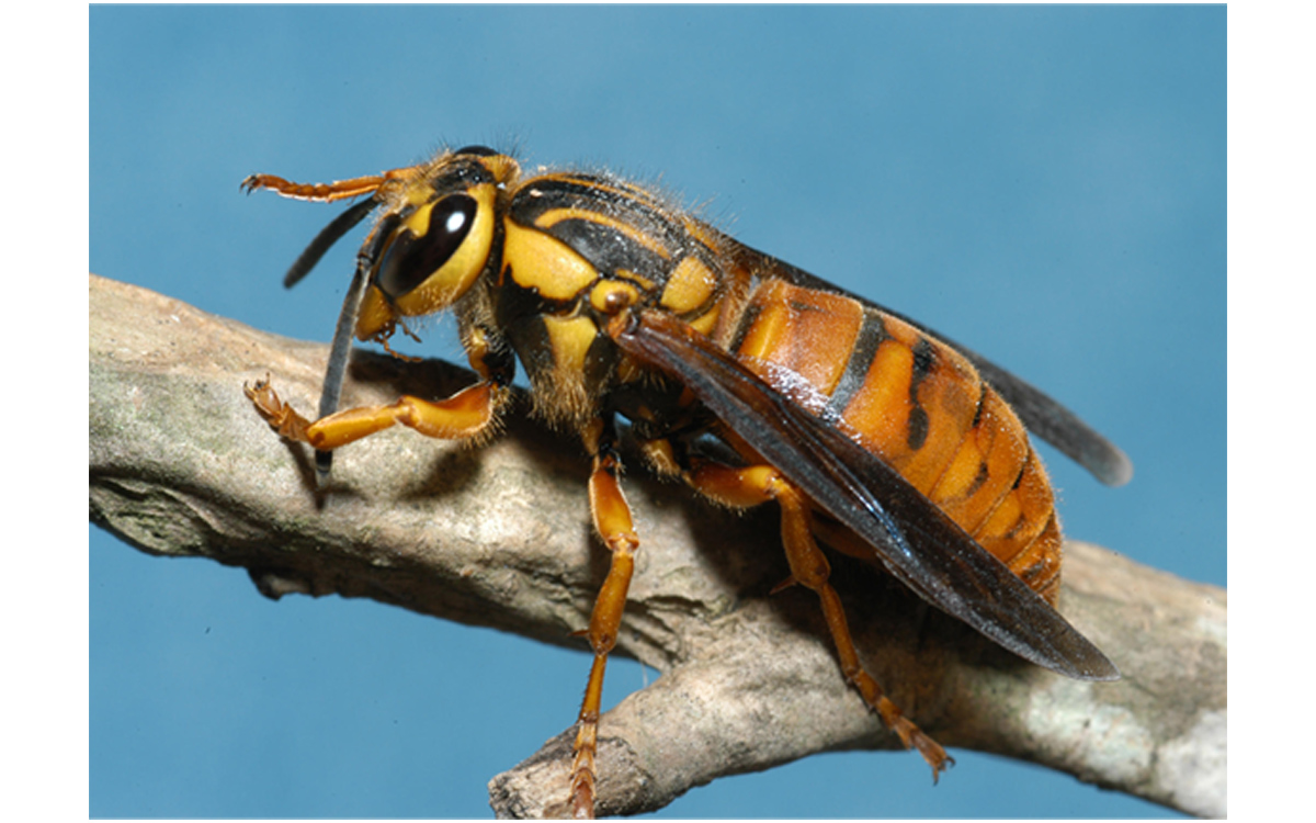 Asian giant hornets can be more than 2 inches long. They have large, orange heads with big mandibles used to kill their prey, which include honey bees. Their bodies are black with orange stripes, and they have large, clear wings. Their long stingers can inject potent venom that sometimes causes severe allergic reactions and possibly death in humans and large animals.