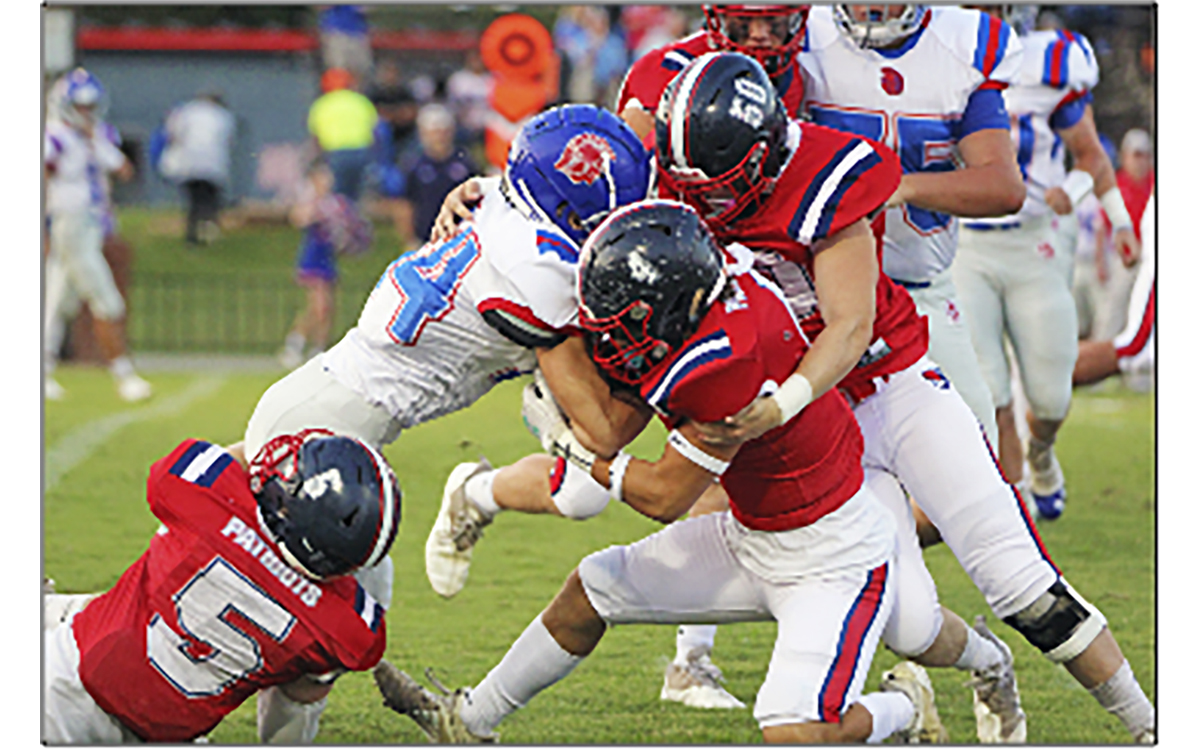 As the Patriots rolled up 436 yards in the ground and in the air, they were led in rushing by Omar Scott with 94 yards and 2 touchdowns. He was followed by Jett Joiner with 65 yards. Brylee Wall had an outstanding night in passing as he threw for 267 yards and 3 touchdowns, while suffering 1 interception. His main receivers were Will Thompson with 2 receptions for 111 yards and 2 touchdowns and Max Fulcher with 42 yards while Jack Wooten had 37 yards and one score. They were followed by Secrata Miller with 30, Bryson Wright with 25, and J.T. McGinnis with 22. Brylee Wall also converted on a 23 yard field goal and 4 PAT's.