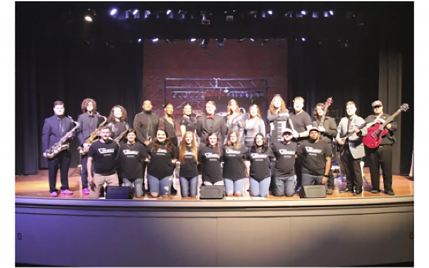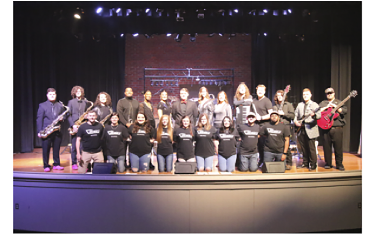 Members of the East Central Community College Collegians rock and roll band and their respective high schools include (front row, from left) technicians Ethan Smith of Union, Audrey Pugh, a homeschooler from Newton, Shelby Bates of Sebastopol, Rebecca Melton of Scott Central, Sydney Miller of Newton County, Madison McLemore of Sebastopol, Margarita Castillo of Forest, Nathan Vance of Union, and Taylor Clark of Enterprise; and (back row, from left) Saxophonists Brodie Denson of Sebastopol, Tyler Burnham of Louisville, and Lauren Gilmer of Newton County; trumpeter LaDarrien Paten of Louisville, vocalists Jaedyn Jefferson of Northwest Rankin, Annabelle Fry of Union, Wyatt Bryan of Neshoba Central, Allison Pickel of Sebastopol, and Jocey Bell of Scott Central; keyboardist Amos Rigdon of Newton County, drummer Garret Johnston of Union, bassist Devin Reed of Nanih Waiya, lead guitarist Zebariaha Spire of Neshoba Central; and director/guitarist Chas Evans who also serves as chairman of the Fine Arts Division. (EC Photo)