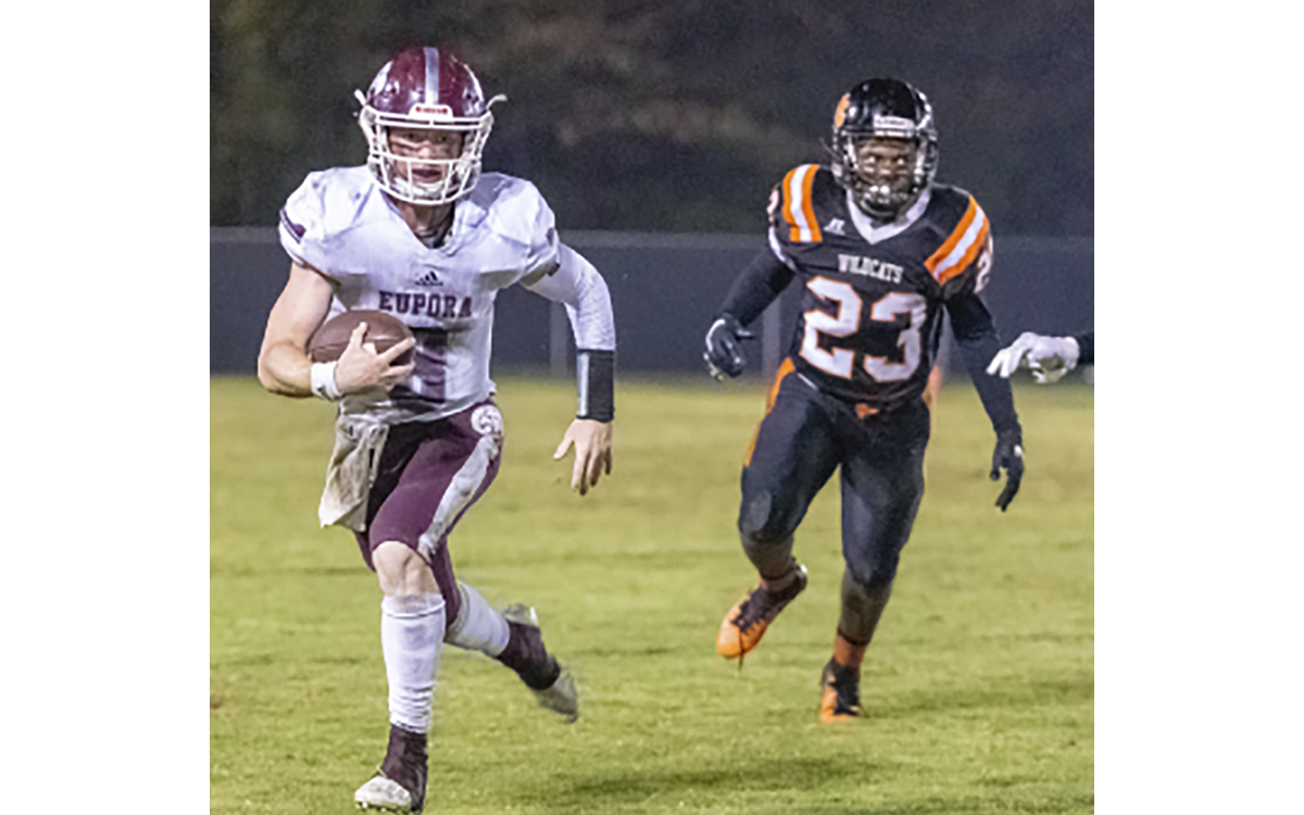 The Eupora High School football team had its hands full last Friday night hosting the Class 2A, Region 2 front runners in Calhoun City, but the Eagles weren’t going to back down. Though Eupora was in striking distance for most of the game, they couldn’t make enough plays offensively to overcome the Wildcats. The defense held up until late before CCHS was able to pull away with a deceptive 24-7 win. “It was a 12-7 ball game with 9 minutes to go and they had a couple of plays to stretch it out, but we should have had it a one possession game to finish out,” head coach Stephen Edwards said. “There were a lot of plays for us to make especially in that first half. We got the ball down inside the 20 and couldn’t score and they got a defensive score that gave them the lead. That hurt for sure. “At the end of the day, Calhoun City is Calhoun City and somebody is going to have to knock them off the perch before they can claim the conference.” The Wildcats (3-3, 2-0 Region 2) earned a forfeit win over East Webster two weeks ago and came in with a chance to solidify themselves back up top in the division. They’re a win away from clinching it yet again. The visitors certainly weren’t as formidable as they have been in the past, but they still controlled the ground game best they could. The Wildcats had 166 yards rushing and 146 through the air as they got 89 yards on seven carries from Jaylen Artberry who had 68 of those on one play. Jackson Lee also had 15 carries for 50 yards. Eupora kept a lot of big plays in front of them with Tra Mccomb making 12 tackles and 1.0 tackles for loss and Kyle Kilgore six tackles and 2.0 TFL. Quintavis Morris was very disruptive in the backfield notching 3.0 sacks in the loss as the team continued to play with confidence on that side of the ball. “I think overall we’re playing a little harder than we have in the past,” Edwards said. “These younger kids have really put pressure on the older ones, but the seniors have stepped up too. Once they saw the younger guys and the talent they have, the older guys kind of picked their pace up. They’ve been the leaders that we hoped they would be.” Calhoun City got the first score of the game late in the first quarter before the Eagles marched it right back down the field and finished off a drive with a Ty Murphy 1-yard score. On the next possession, however, Eupora failed to get points and CCHS would score thanks to a turnover to take the 12-7 halftime lead. That sequence proved to be costly as Eupora’s defense tried to hold on as long as it could. Calhoun City got two more scores in the final frame and they were able to push the lead out a bit to make it look more comfortable than it actually was. The offense finished under 200 yards against the stingy CCHS front. Murphy managed 15 carries for 58 yards and a score and was 8-of-21 passing for 68 yards and an interception. They were aided by some strong punting from Kimble Dillinger with five punts averaging 40 yards and one inside the 20. It’s still in the hands of the Eagles to get the No. 2 spot in Region 2. Their next match up comes against J.Z. George this week who sits at 3-2 and earned a forfeit win over East Webster this past week. The Jaguars have losses to Winona and Walnut and wins against Leake County and Central Holmes Christian Academy. Edwards said that every game from here on out is as crucial as ever and they’ll need a good night on the road. “They’ve got some skill guys that can run and have a division win right now. It’s that next big game for us where we seed ourselves. We’ve got to handle our business,” Edwards said. “They’re going to be a little bit faster than us and we’re going to have to bend but not break.”