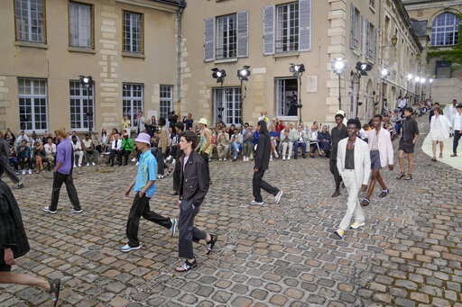 PARIS (AP) — Loewe thrust Paris Fashion Week into a bleak and dystopian vision of the future on Saturday -- turning its runway into a dead space where nature and animal life only existed to be harnessed and exploited by humankind. A sanitized white wall descended onto a bare deck as models walked by robotically, bathed in misty white light.