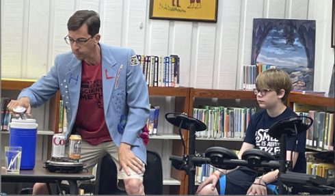 Swanson had Adalai Jones assist him with a rainstick and Linley Kate Reed with an experiment with water. She thought she was going to get wet but actually only a small amount dripped on her. He also had a telescope and showed the children sunspots through it.