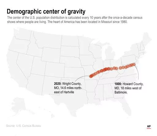 The nation’s population center is calculated every 10 years after the once-a-decade census shows where people are living. The heart of America has been in Missouri since 1980. Previously located in Plato, in the neighboring county, it moved only 11.8 miles (19 kilometers) southwest from 2010 to 2020. It is the smallest distance shift in 100 years and the second-smallest in U.S. history.