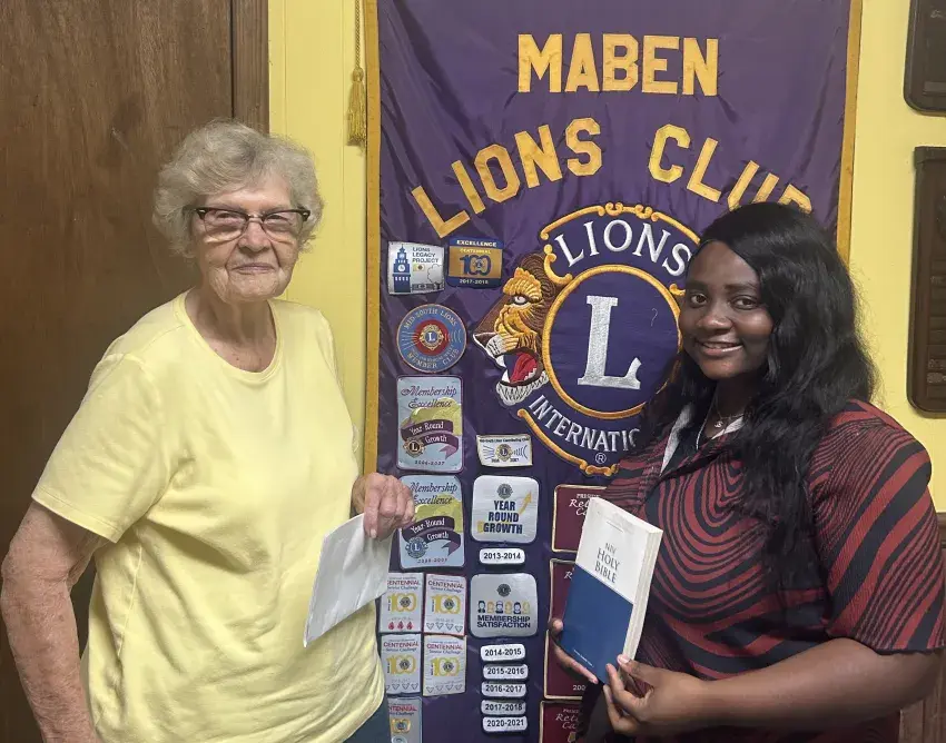 Maben Lions Club member Pat Harpole, in collaboration with the club, purchased a Light for Sights in honor of Lion Nellie Blade, who died Aug. 1. This shows support for the White Cain Program of Mississippi. Lion Akeah Mays, CEO of I Love Me Ministry, donated a Bible to the Maben Lions Club in honor of Blade.