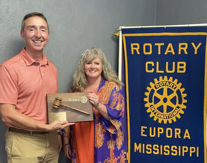 Michael Kolb, president of the Eupora Rotary Club, presents a gavel plaque of appreciation to Past President Robin Mixon for her dedicated service and leadership during the 2024-25 club year. The club presented her the plaque on Aug. 4.
