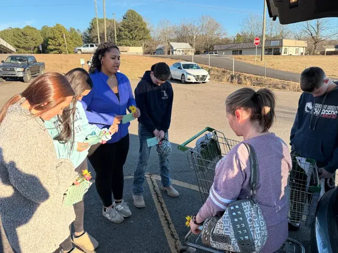 Olivia Alashti (center), a student at Choctaw County High School and a member of Mt. Moriah Baptist Church leads a prayer with other DNow over local business in town in the parking lot of SuperValue. At each business, the youth also left a card with a bible verse.