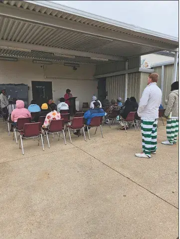 The Choctaw County Jail held its annual Thanksgiving Day service for inmates. Local churches in the area rotate to hold service and to serve a hot meal to those who are incarcerated. Pictured, Charlotte Miller with Mt. Salem stands to introduce their pastor, Rev. Lyndon B. Geeter. Geeter is also the pastor of First Unity United Methodist Church.