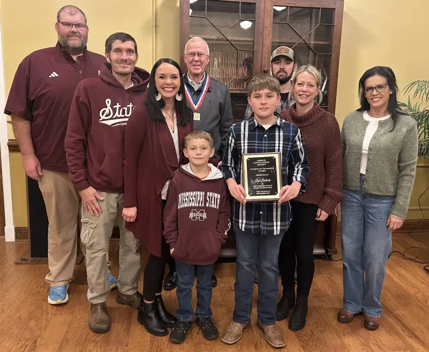 STUDENT OF THE MONTH: Case Roberts from East Webster High School is the Webster County Board of Education’s Student of the Month for September. Accompanying him at the board’s Dec. 8 meeting are his family, Cory, Mallory and Camp Roberts; and EWHS Assistant Principal Matt Snow.