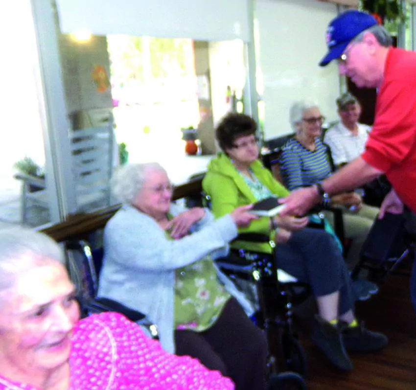 Song books were given to the residents, who helped the group sing, with Ginger Carden at the piano.