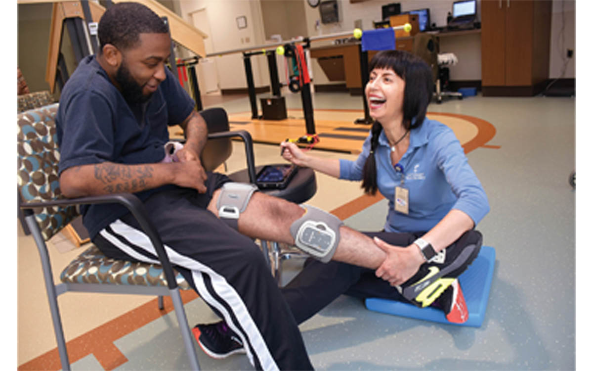 “It’s a cuff that straps right around the lower leg, and it stimulates the peroneal nerve, which activates the muscles in the lower leg which lift the foot up,” Hankins said. “A traditional orthotic brace, like an ankle-foot orthosis (AFO), locks them into a certain position to block foot drop. The Bioness lets them use their muscles, which is a lot more natural, because traditional bracing can make muscles atrophy from not being used and can also restrict blood flow. Plus, you have to wear this bulky brace that may not work with your normal shoes.”