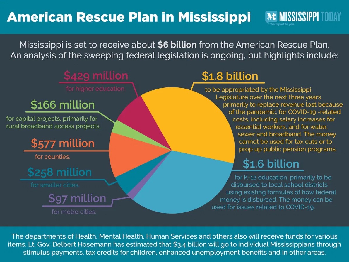 Mississippi will receive about $6 billion from the federal American Rescue Act — an amount equal to the entire annual state general budget, and an amount state leaders say could change Mississippi for the better if spent wisely by state and local governments and bureaucrats.