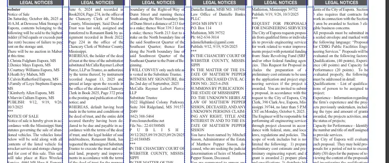 On Saturday, October 4th, 2025 at 10 A.M. at Deweese Mini Storage in Eupora, contents belonging to the following will be sold to the highest bidder (if bid equals or exceeds past due rent) because of failure to pay rent on the storage unit.