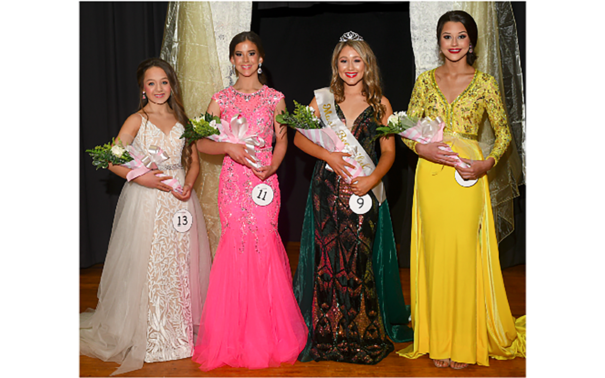 (top, right) Junior High Division: Kinsley Huffman (third alternate), Ansley Mason (second alternate), Most Beautiful Adalee Hardin and Olivia Frank (first alternate)