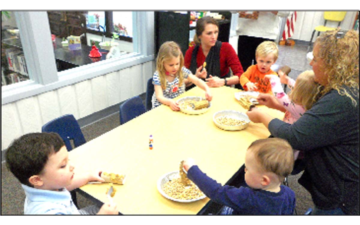 We had some peanut butter crackers after we made bird feeders with peanut butter and birdseed. Then we went outside and hung the birdfeeders in a tree. And as usual the children played with Play-Doh and listened to music.