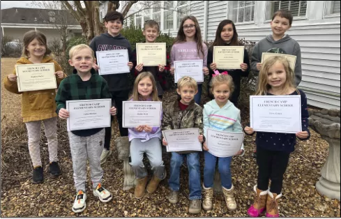 The following students were named French Camp Elementary’s Chargers in Charge for the month of December: Ryan Palmertree, Baileigh Prewitt, Livvy Geiser, Maddie Ward, Caden Ramage, Sam Chesteen, Brighton Martin, Araylee Mooney, Thomas Craig, Ali Jones, Robert Bentley. Not pictured: Joshua Sheedy