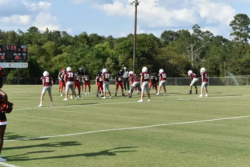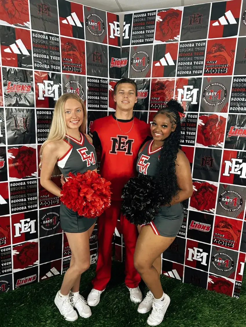 Winston County residents Marly McMillan, Josh Kelley, and Kaylee Goss show their Lions pride as members of the East Mississippi Community College cheerleading team. The trio began their 2025-2026 school year at EMCC and cheered at their first game of the season Thursday at Mississippi Gulf Coast Community College.