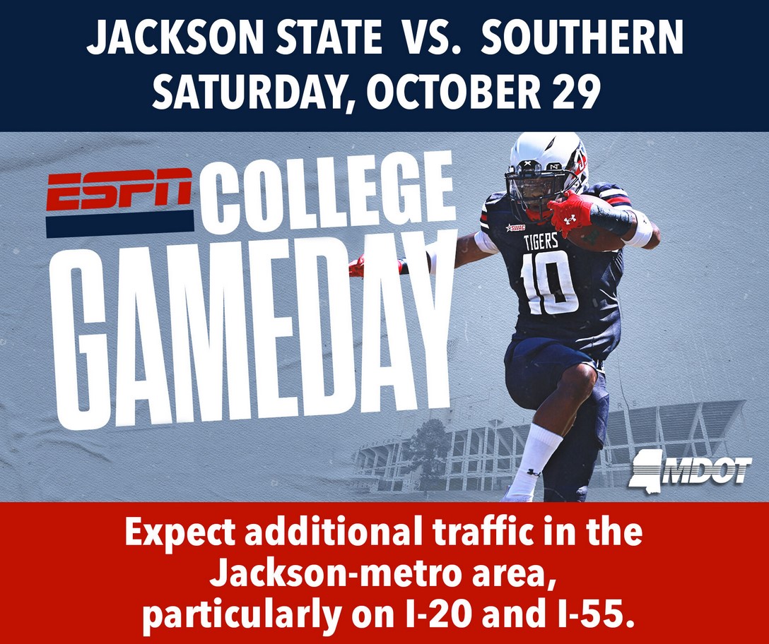 For the first time ever, ESPN’s College GameDay is headed to Jackson on Saturday, October 29, as Jackson State University takes on Southern University. The Mississippi Department of Transportation (MDOT) is reminding motorists to plan ahead, expect additional traffic and allow more travel time in the Jackson-metro area this weekend.