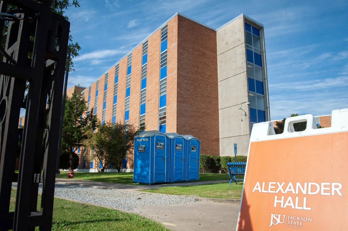 Portable showers remain on the campus of Jackson State University in Jackson, Mississippi on September 1, 2022. Credit: Rory Doyle/Deep Indigo Collective for Mississippi Today