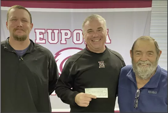 Athletic director/assistant football coach Alex Rawls and football coach Brad Gray accept a $5,000 donation from Joe Fox Wofford Jr. to Eupora High School to continue the annual presentation of the Wofford Trophy through EHS. Wofford made the donation Dec. 19 on behalf of his family to the Wofford Trophy Trust Fund. This is addition to the original gift of $1,000 establishing the trust fund in 1989.