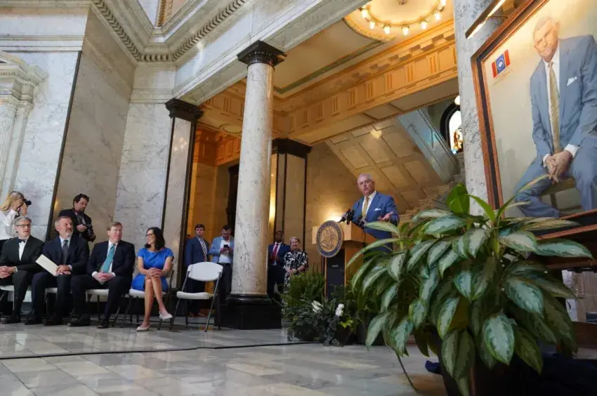 Former Mississippi House Speaker Philip Gunn speaks at the unveiling of his portrait Wednesday, March 25, 2026, at the state Capitol in Jackson. The Republican from Clinton served as leader of the 122-member House from 2012 to 2024. Seated, left to right, are portrait artist Jason Bouldin, current House Speaker Jason White, Gov. Tate Reeves and Gunn’s wife, Lisa Gunn. Credit: Richard Lake/Mississippi Today