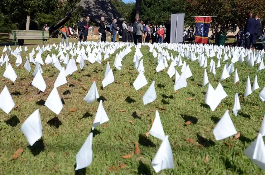Members of the community along with Interfaith clergy from around the state held a memorial service in honor of the 10,000 Mississippians who died due to the coronavirus. Flags were placed in remembrance of those who died during the Day of Remembrance and Mourning: A Requiem for Mississippi event held in Smith Park Tuesday morning, Nov. 2, 2021 in Jackson. Credit: Vickie D. King/Mississippi Today