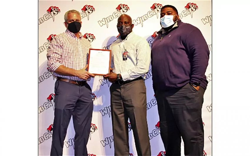In a short ceremony on Wednesday February 24, Louisville Mayor Will Hill met with Louisville Wildcats Head Football Coach, Tyrone Shorter, and Principal Danya Turner, to present to them the “WE ARE THE CHAMPIONS!” Proclamation which was unanimously adopted in a Board of Aldermen meeting the night before.