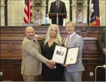 Rocky Vaughan of Ackerman and his wife, Keland, accepted Senate Resolution 65 from Senator Bart Williams, honoring Vaughn’s contributions in designing the new Mississippi State Flag. The Vaughans own and operate Deep South Confection and Design, and have four sons: Ryder, Brody, Ben, and Bentley.