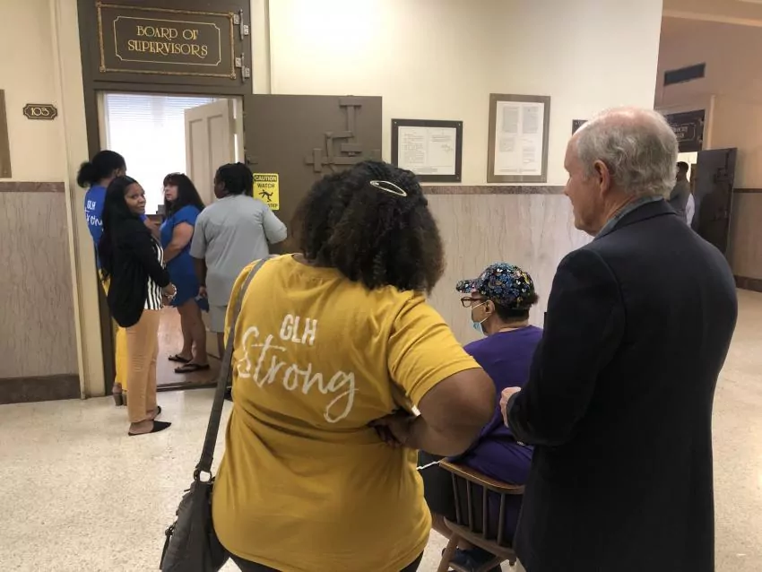 An overflow crowd concerned about the future of Greenwood Leflore Hospital waits for Monday’s meeting of the Leflore County Board of Supervisors to begin. In foreground, with their backs to the camera, are Lora Evans, left, a hospital manager, and Dr. Kenneth Hines, a primary care physician in Greenwood who is now affiliated with the University of Mississippi Medical Center. (By Tim Kalich)