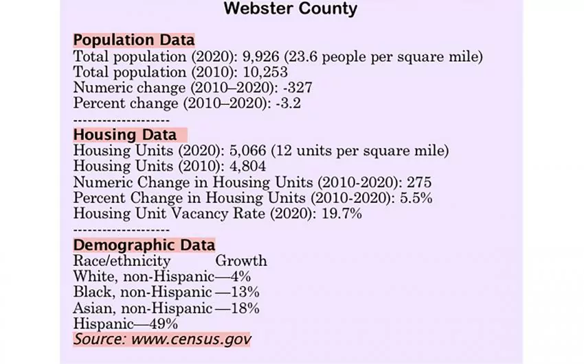 Webster County’s population according to the 2020 Census is 9,926, which is down from the 2010 decennial census count of 10,253.